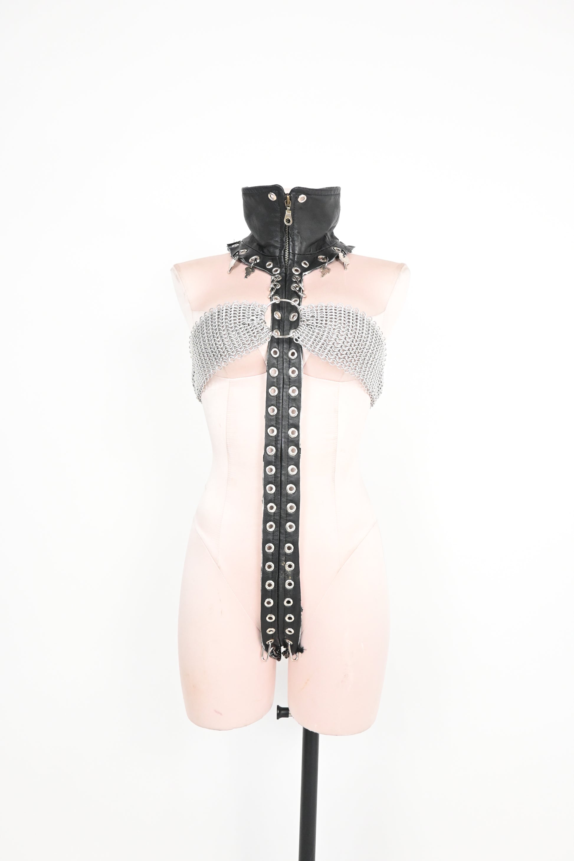 LEATHER COLLAR HARNESS WITH ADJUSTABLE CHAINS AND CHAINMAIL BRA ATTACHED