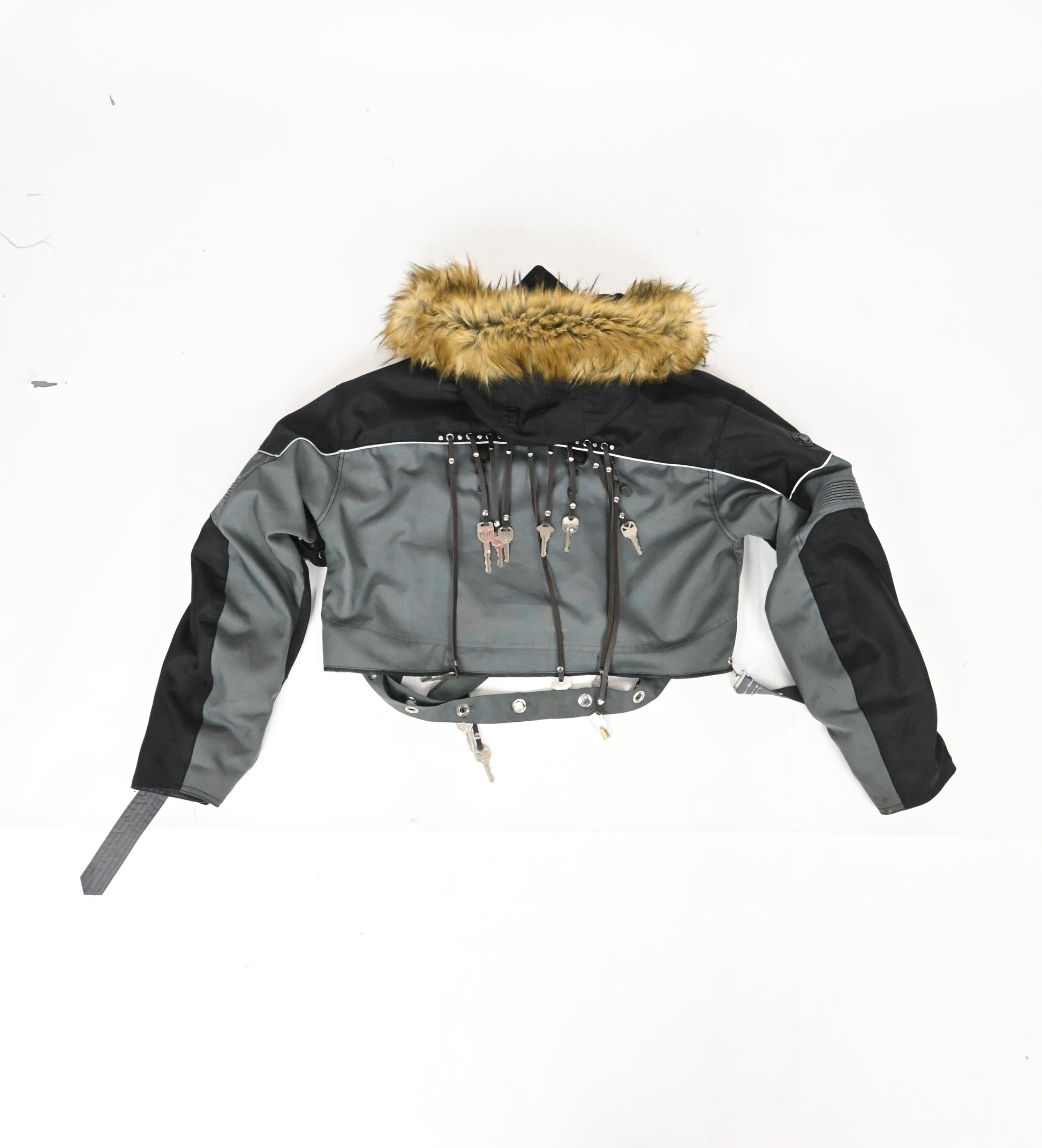 cropped moto jacket with fur hood, silver hardware, and keys