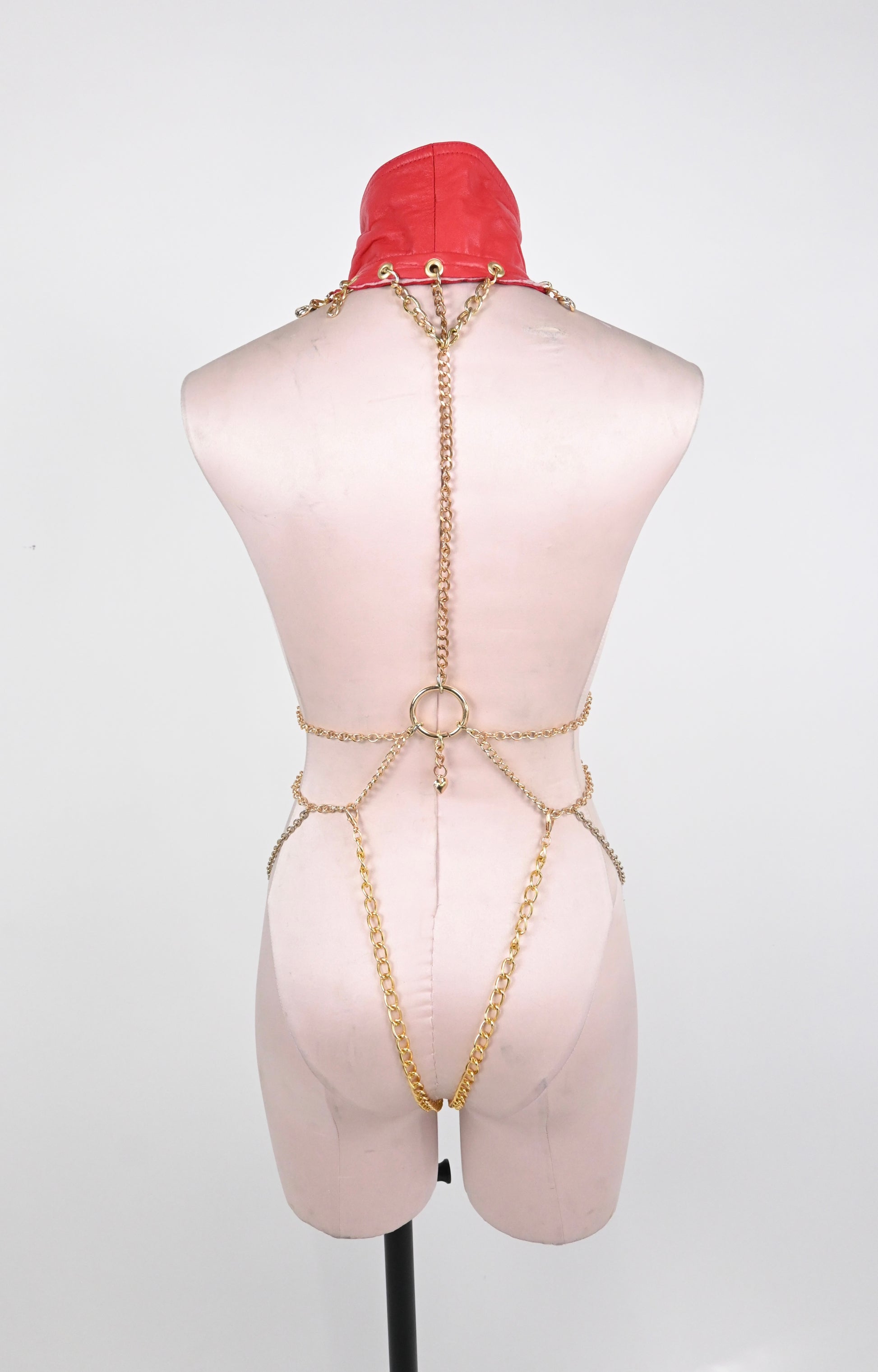 red leather harness with gold chains and hardware