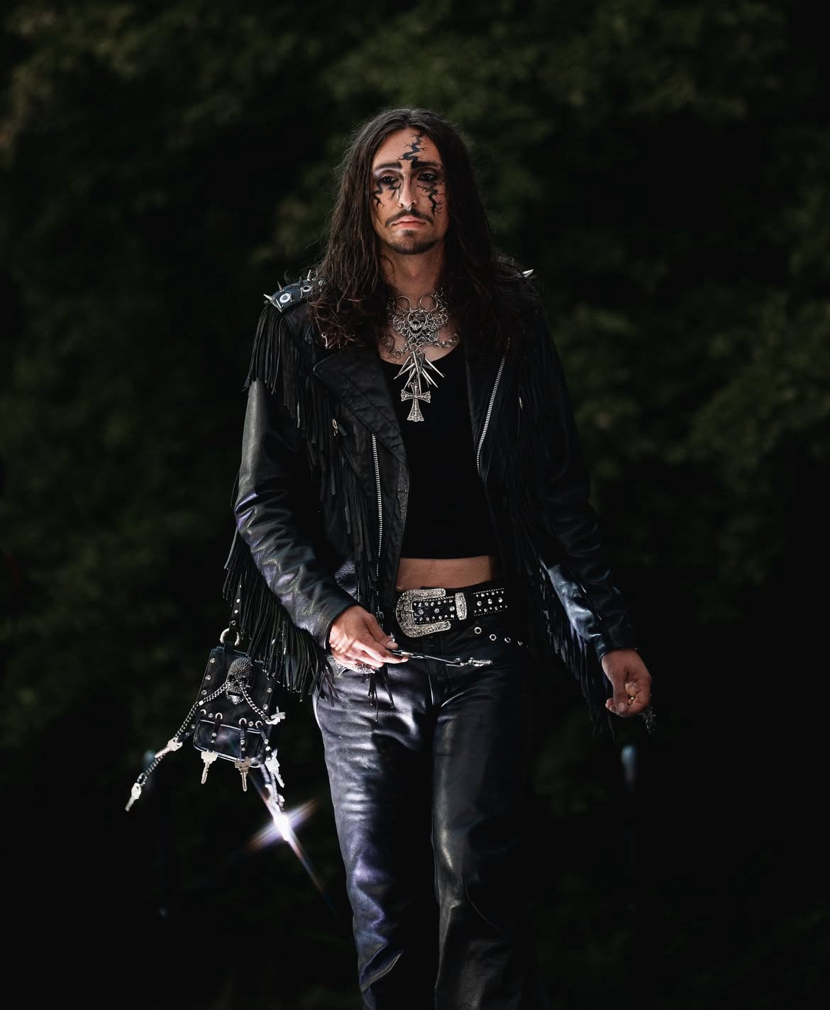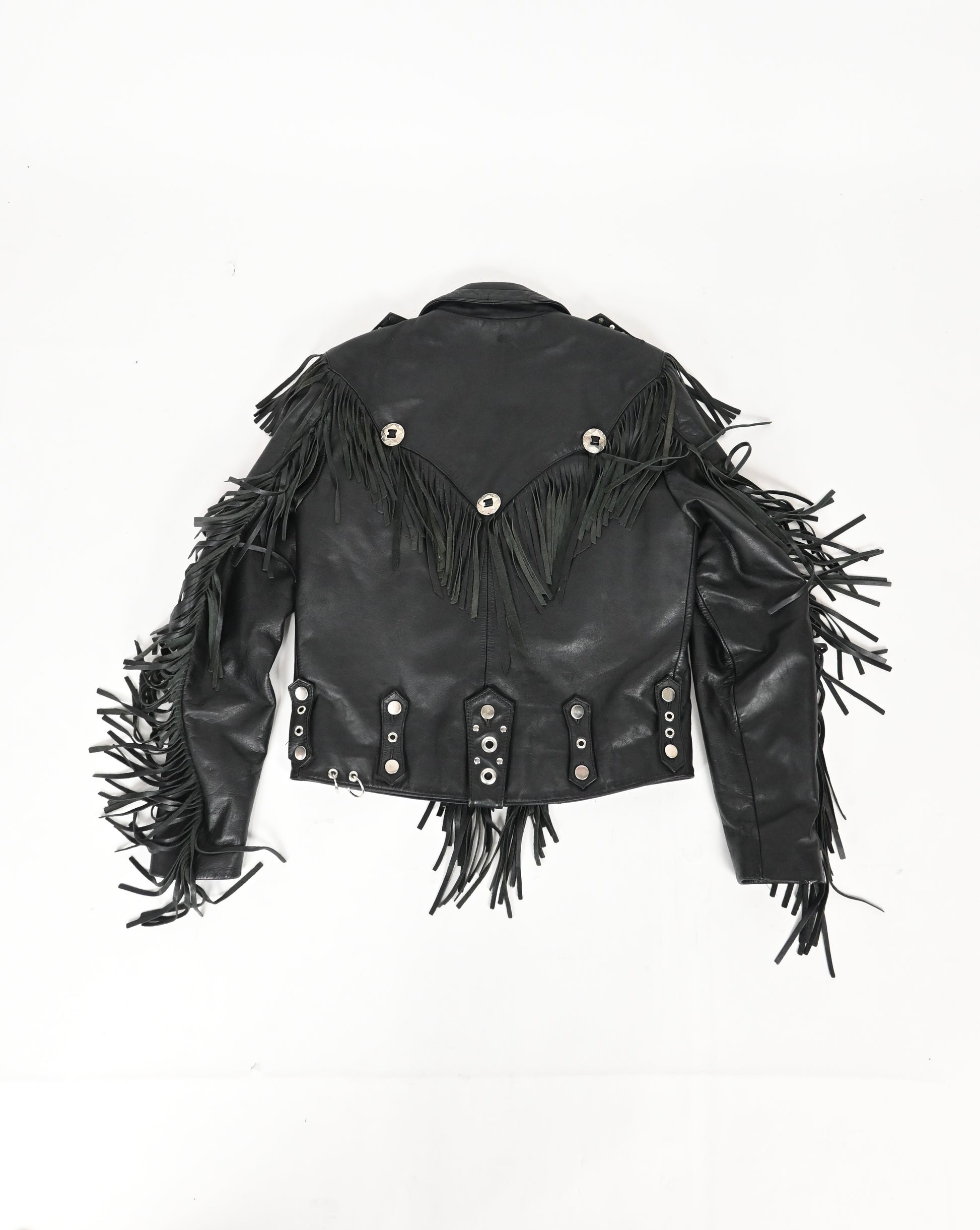 Tassel leather jacket with silver hardware, spikes, and piercings